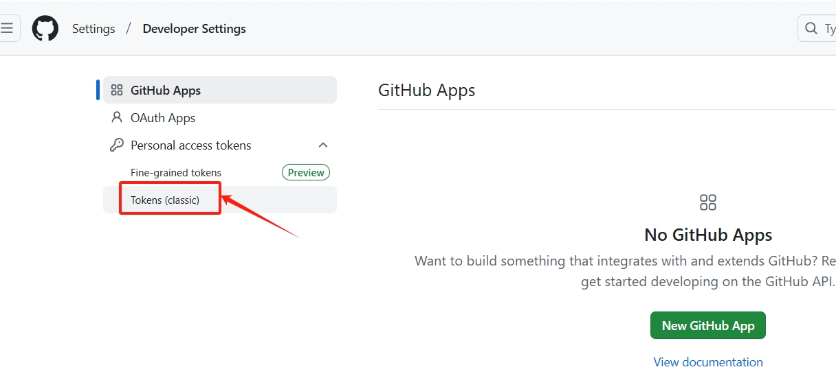 然后,在 GitHub 上生成一个 Personal access token(个人访问令牌),用于身份验证。在 GitHub 网站上登录账户,点击右上角用户头像,进入 Settings(设置)页面。在这个页面中左侧侧边栏选择 Developer settings(开发人员设置),然后点击 Personal access tokens(个人访问令牌)菜单里的 Token classic,点击 Generate new token 开始创建一个新的令牌,注意一定要选择 classic 方式。