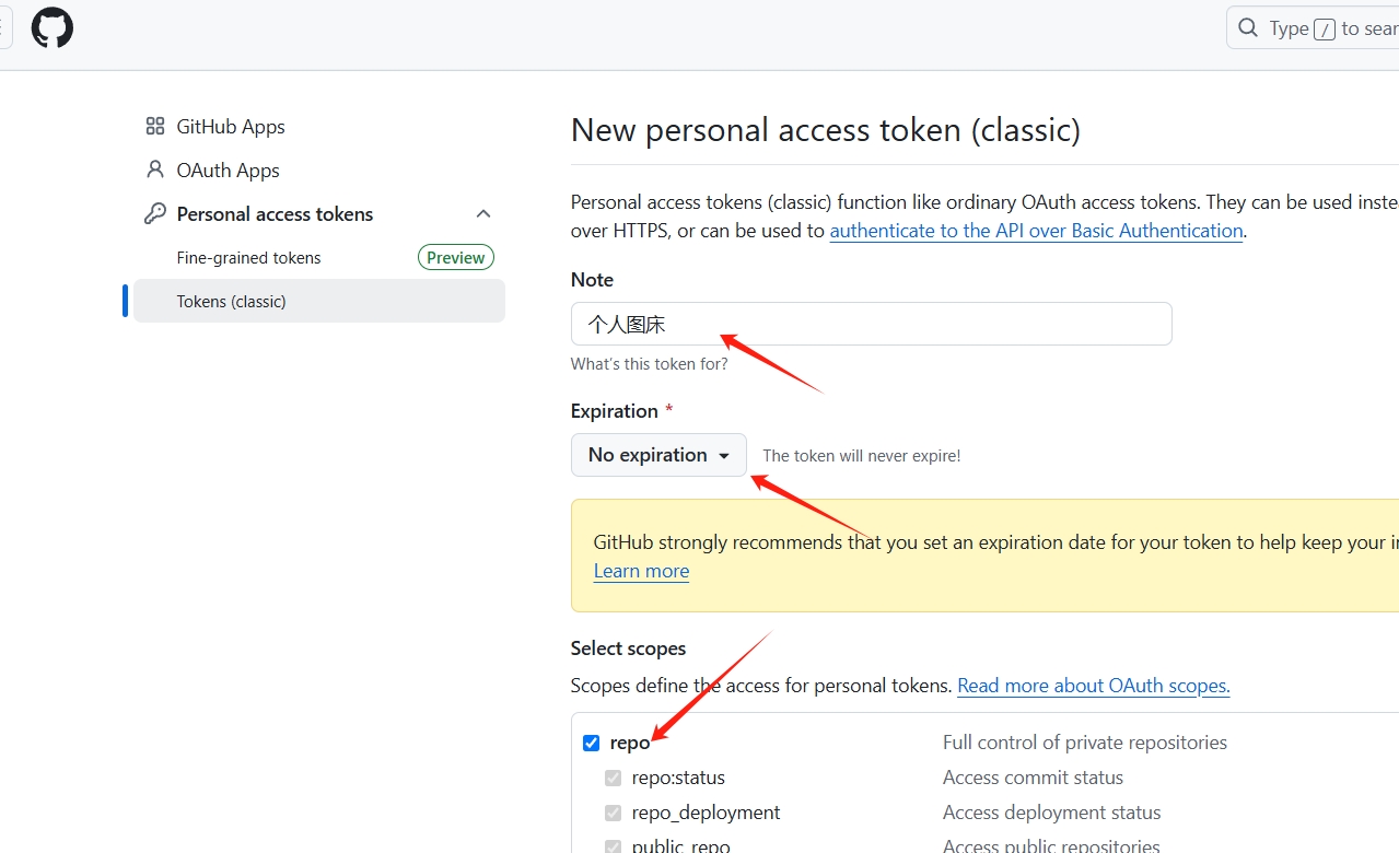 在创建页面中,填写 Note 为 “图床”,Expiration(过期时间)为 No expiration(永久),在下面的 Select scopes(选择权限范围)如下图勾选 repo。最后点击 generate token 生成令牌即可。
