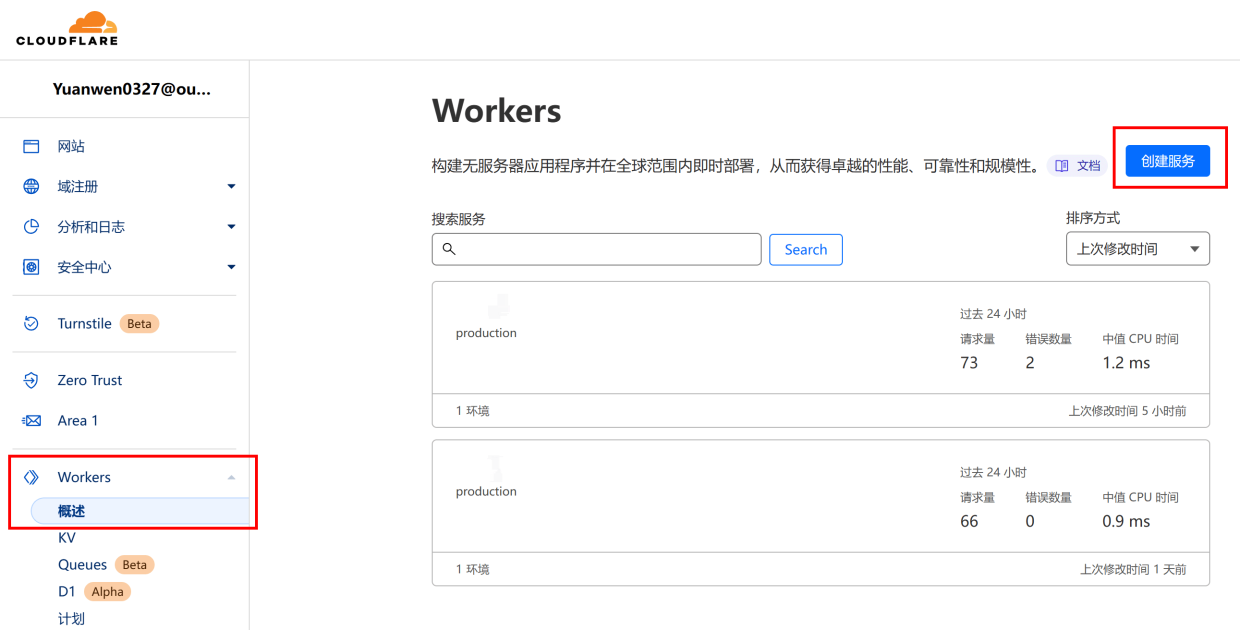 登录到 Cloudflare 的管理界面后,点击侧边栏的 “Workers” 选项,然后点击 “创建服务” 创建一个 Worker。