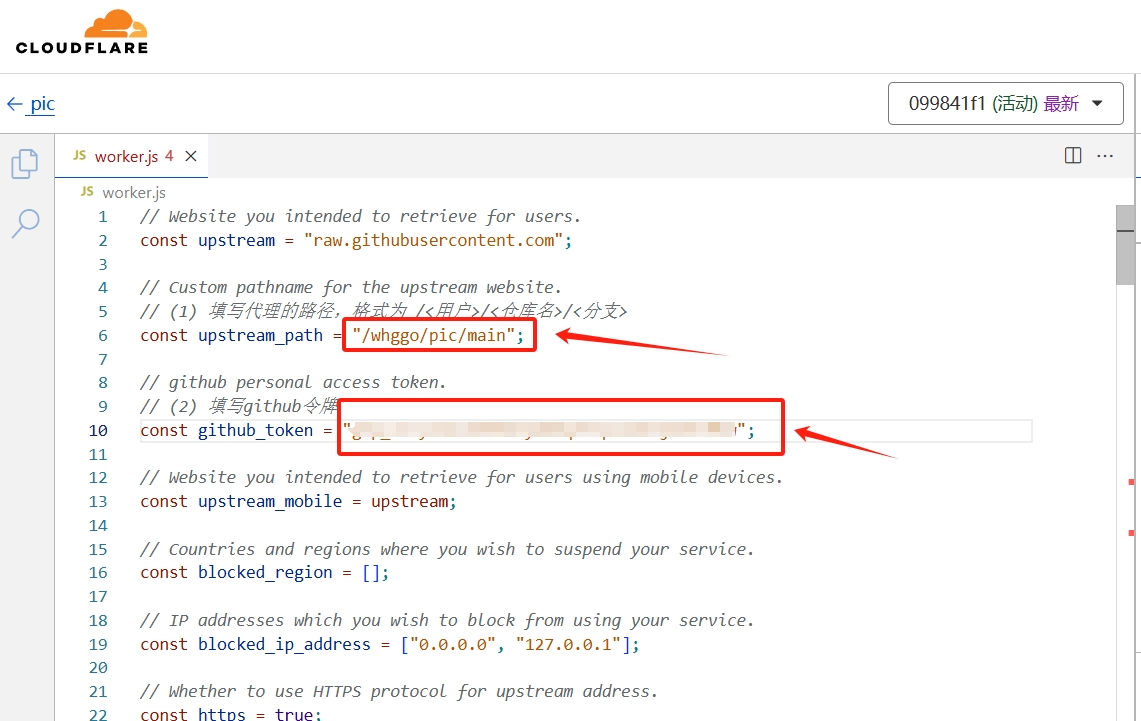 如图,有 2 个地方的代码需要自己修改一下。第一个是代理的路径,需要改写成自己的用户 / 仓库 / 分支,用户和仓库可以在 github 私有仓库页的 url 上看到,如 https://github.com/whggo/pic,whggo 是用户名,pic 是仓库名,分支现在一般默认是 main。第二是令牌,需要修改成之前 github 上申请的令牌。