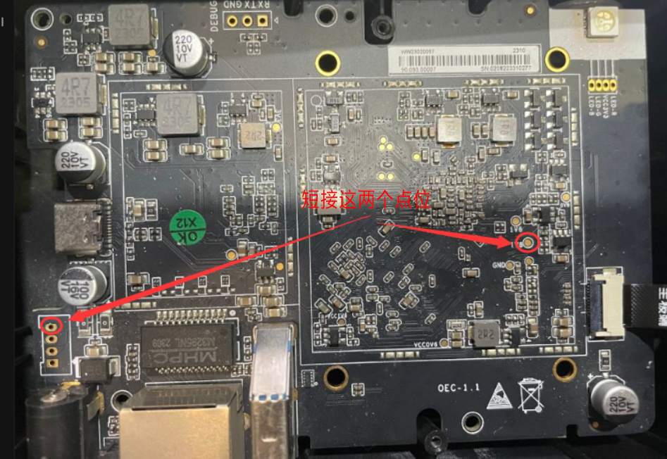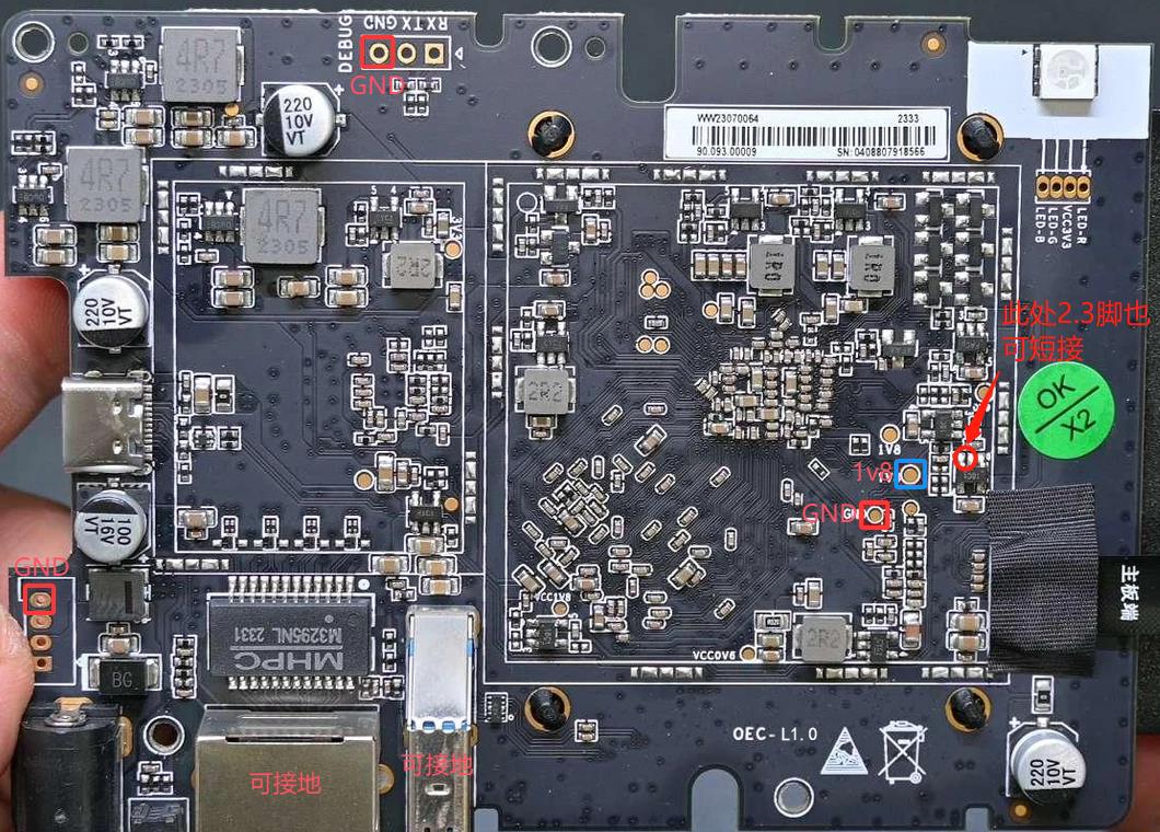 我查了半天资料,找到了三个版本的OEC-turbo盒子,L1.0,1.1和L2.0三个版本,每个版本短接点各有差异。如未发现Maskrom设备,一般都是短接的问题。