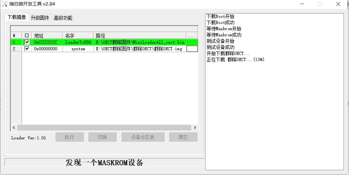 - 我用的是V2.84的刷机软件,如果用高版本的刷机软件,会造成地址不对且缺失了需要的loader部分。还会造成无论怎么更换短接方法都无法成功下载boot。有USB2.0的优先用2.0接口和线。