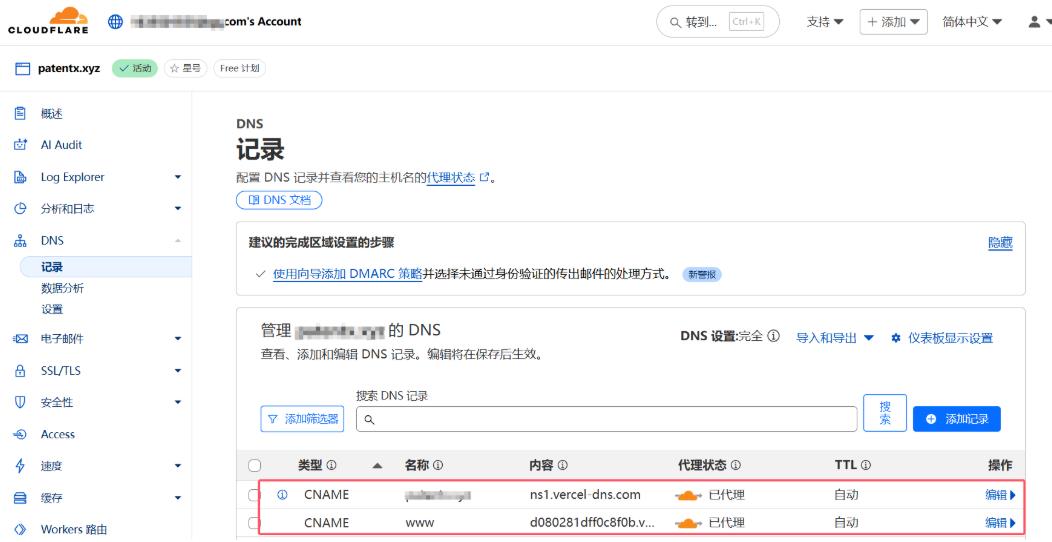 - 记录 2(www 访问,如.vercel.app),注意开启云朵。