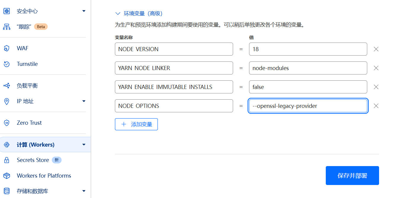添加构建命令、输出目录和环境变量信息,如下: