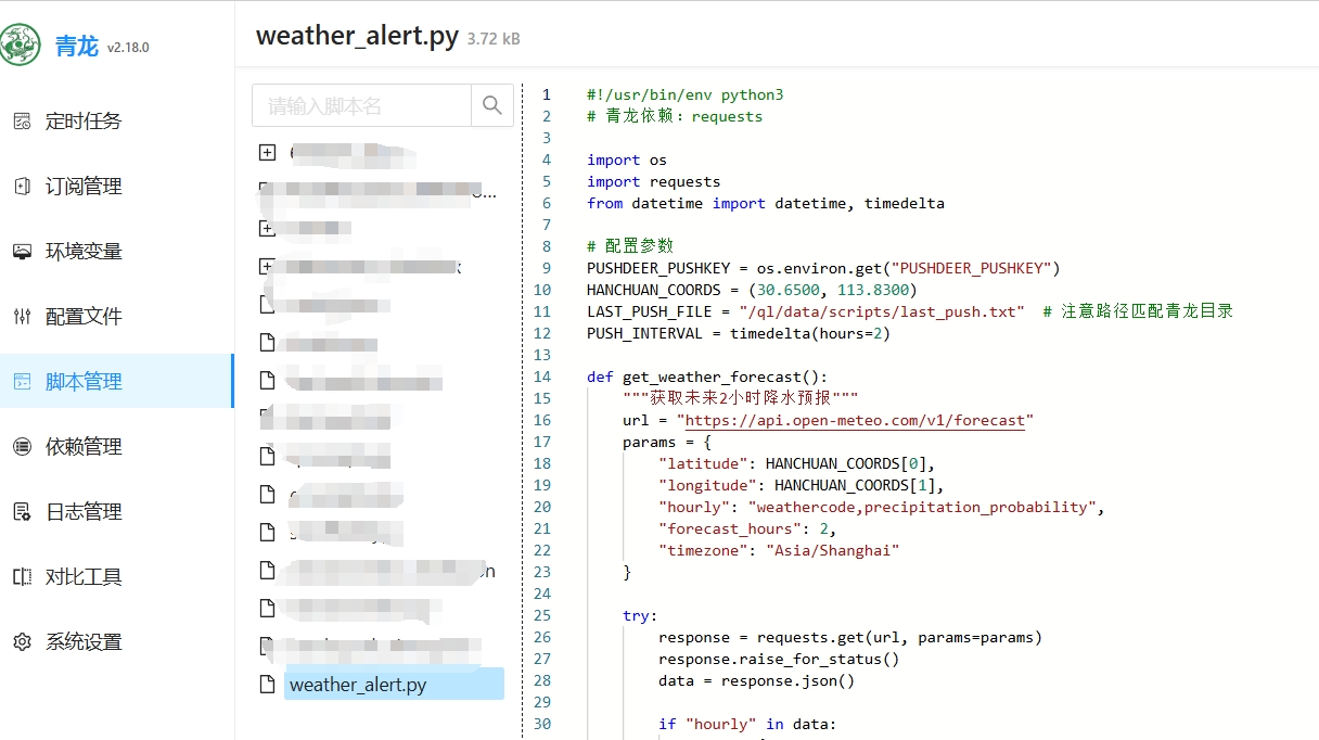 2、进青龙面板,新建一个脚本命名weather_alert.py,把下面的代码粘贴进去。修改上面获取到的经纬度。如下图: