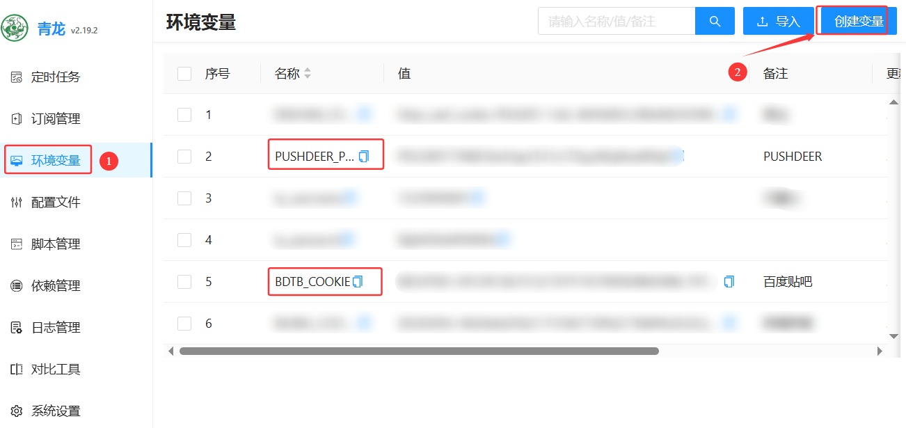 - 进青龙面板,添加推送环境变量PUSHDEER_PUSHKEY和贴吧cookie变量BDTB_COOKIE。如下图: