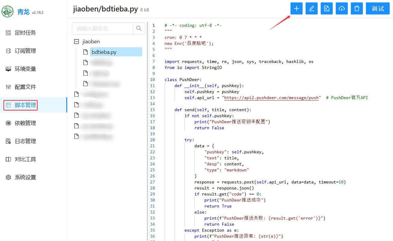 - 进脚本管理里面,添加脚本bdtieba.py,如下图:
