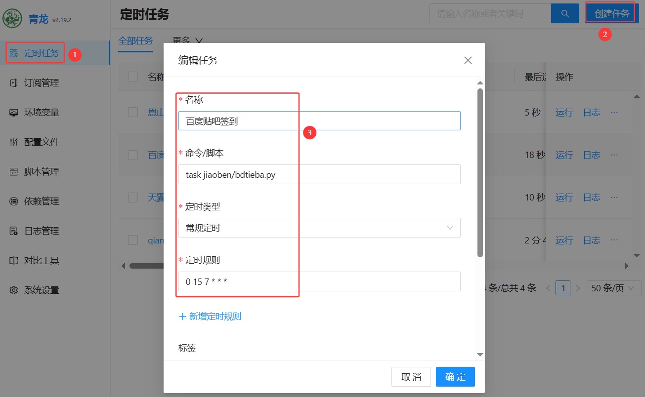- 进定时任务目录创建任务,名称任意写,命令脚本填写:tqask 目录/bdjiaoben.py,如图所示: