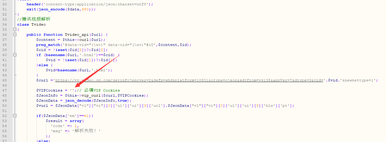 访问你的域名/index.php?url=https://v.qq.com/x/cover/mzc00200mhcv61p/c0046jmqwhk.html&type=json - 如果没有填写 Cookies(即腾讯视频 VIP 账号的身份验证信息),那么这段代码就无法正常解析播放地址。