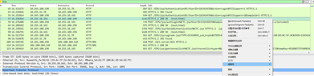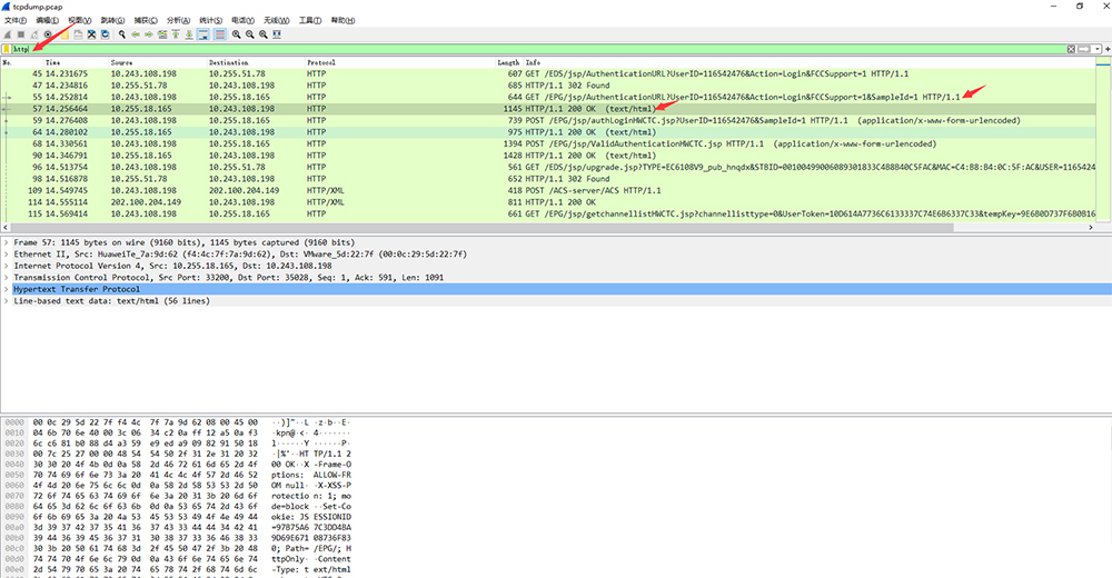 - 抓到的文件下载到本地,用Wireshark打开分析,如下图: