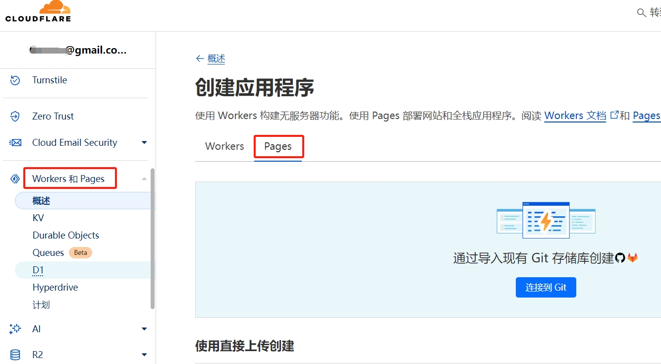 - 在workers和pages页面里面,部署一个pages页面,如下图: