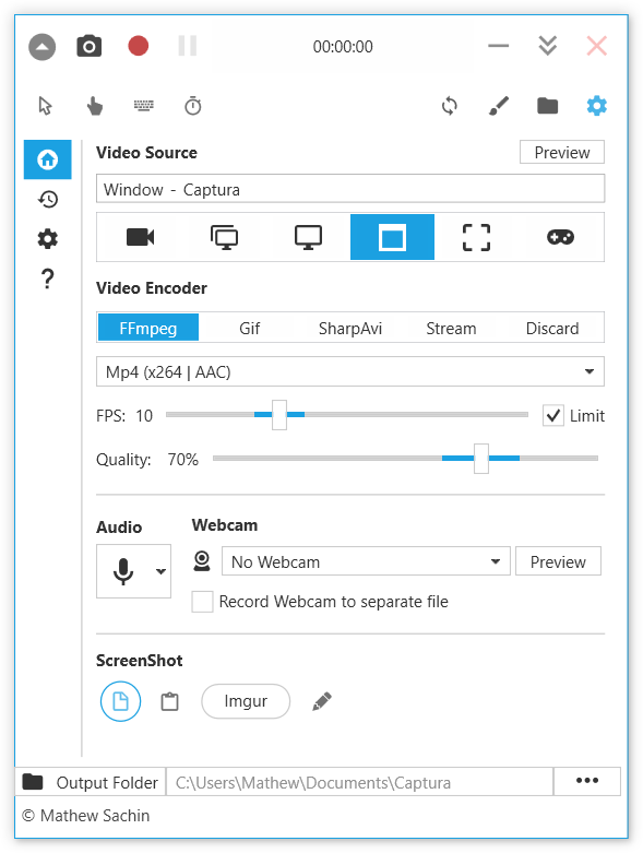 Captura 是免费而且开源的录像软件,功能丰富。录制的内容可选:仅音频、摄像头、桌面(跟随鼠标、全屏、窗口、固定区域)。音视频质量可调。