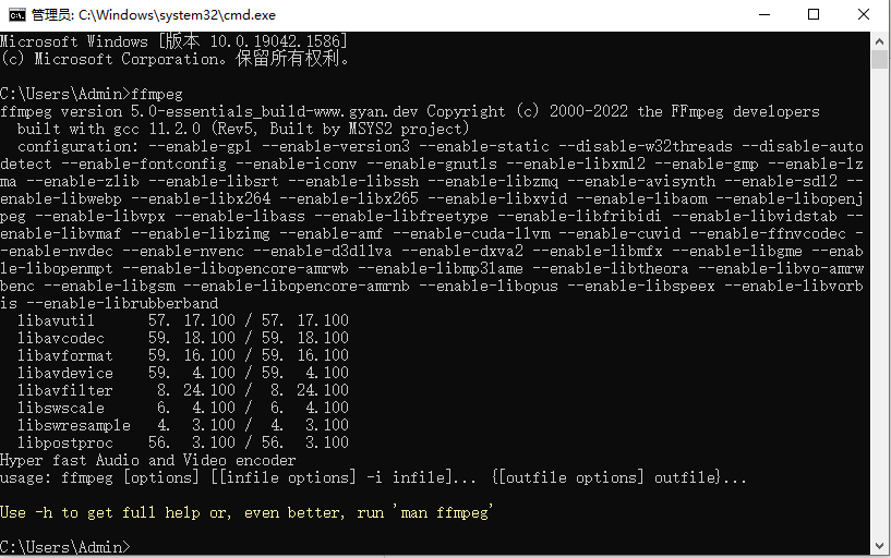 在cmd命令行窗口中输入:“ffmpeg” 并回车。