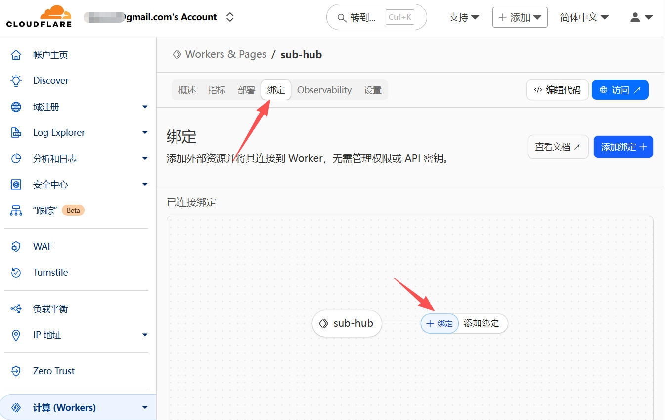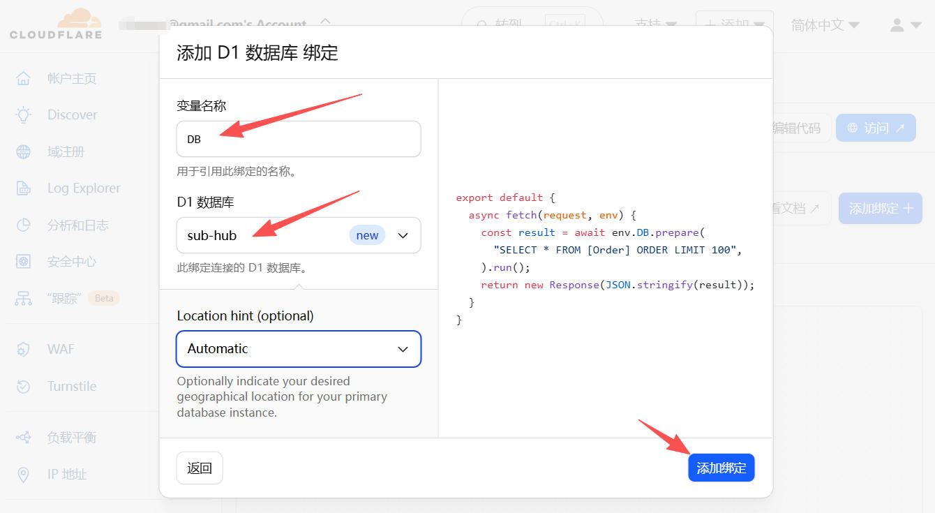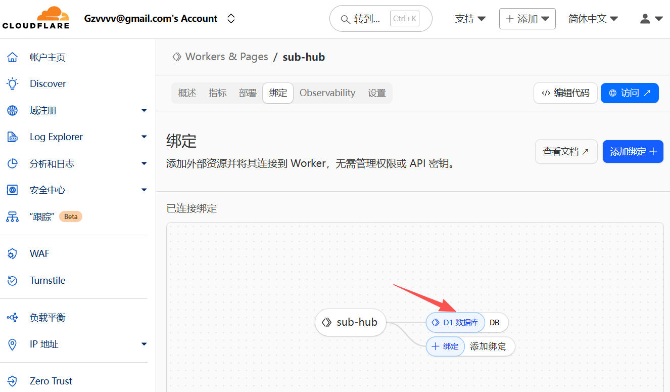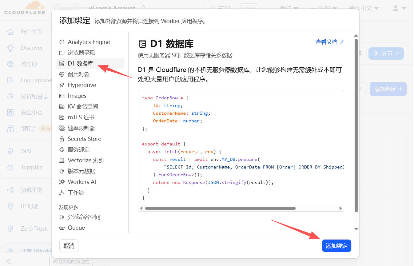 2、在workers应用里面点击菜单的绑定,按提示创建D1数据库并绑定。如下图: