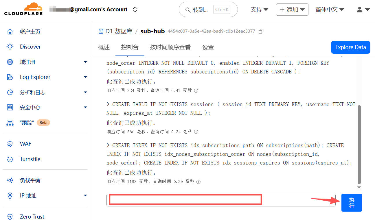 3、workers里面点击绑定好的D1数据库进入数据库控制台,运行下面命令。如下图: