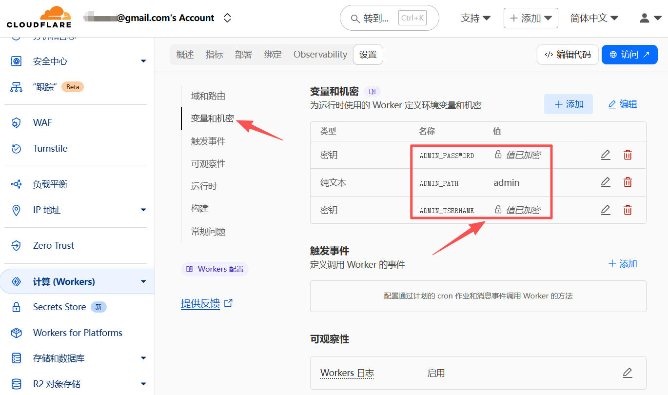 4、在workers设置-变量与机密里面添加以下变量信息: