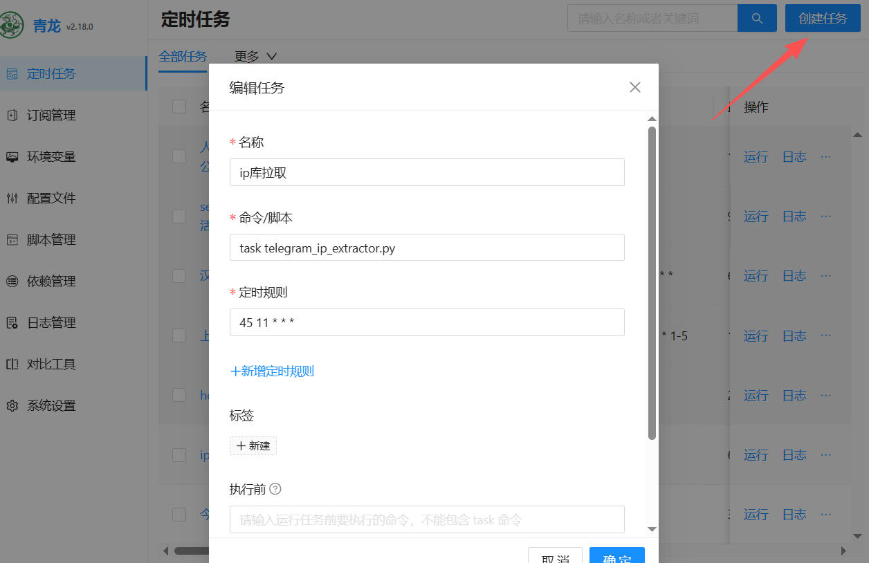 4、 点左侧的定时任务,创建任务。任务名称随意,命令脚本task telegram_ip_extractor.py,定时规则自己定义。