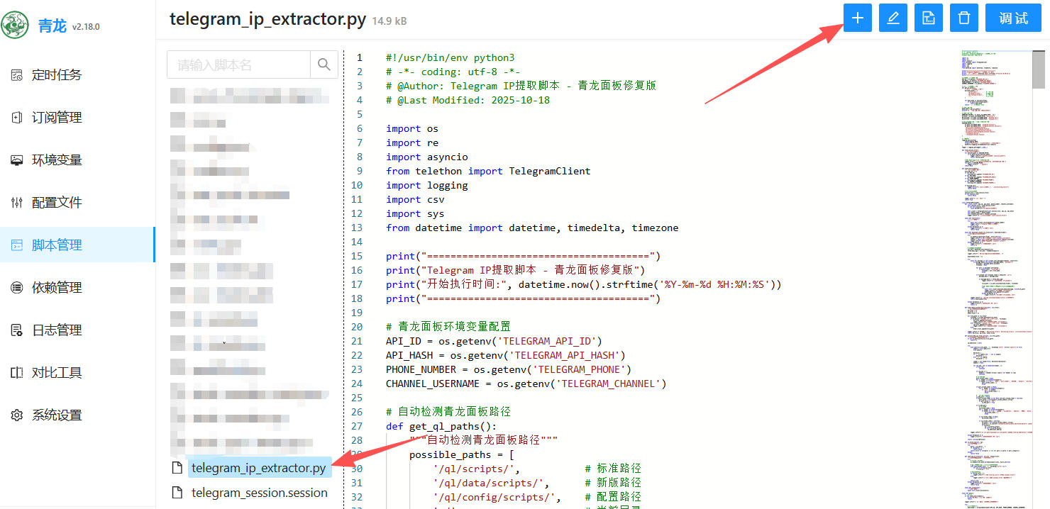 3、 进脚本管理里面新建一个名为telegram_ip_extractor.py的脚本。把最下面的脚本粘贴进去。如下图: