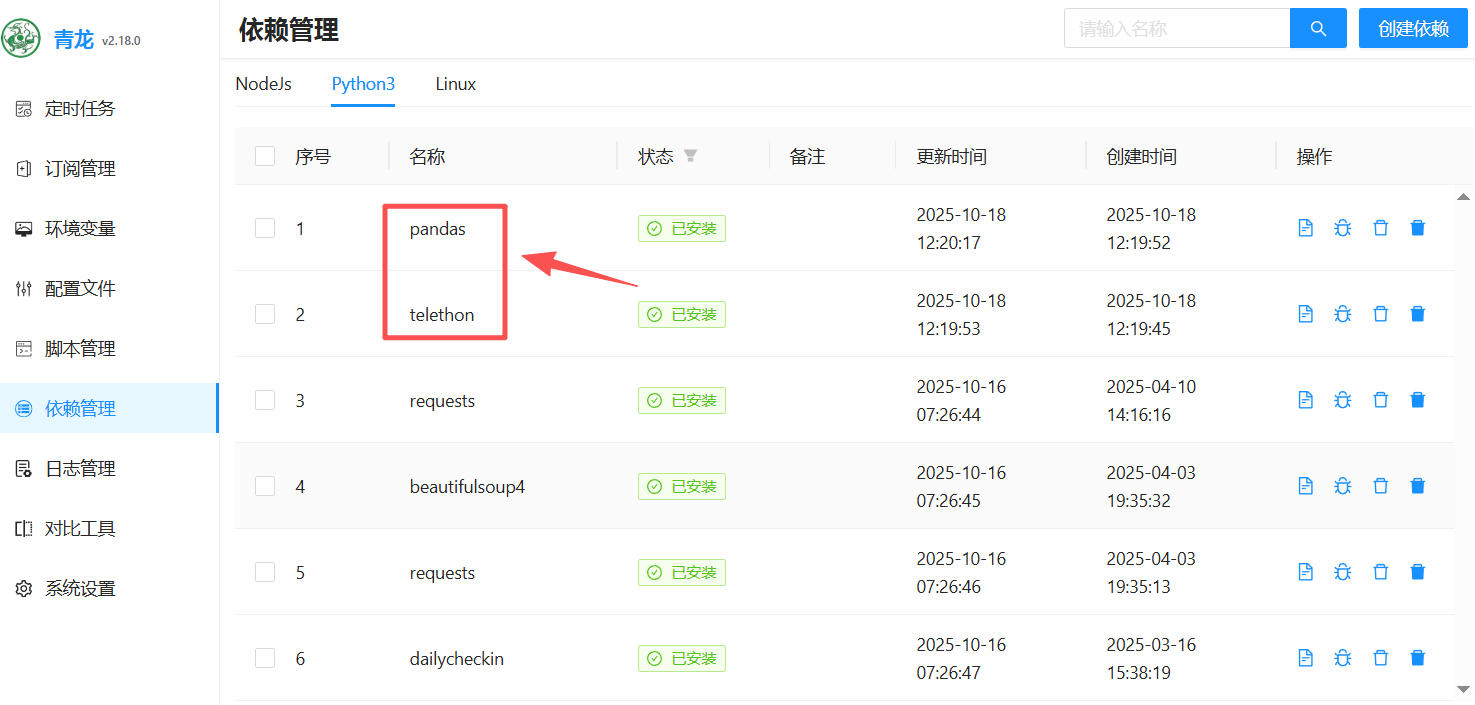 1、 进青龙面板,依赖管理里面安装pandas和telethon。如下图: