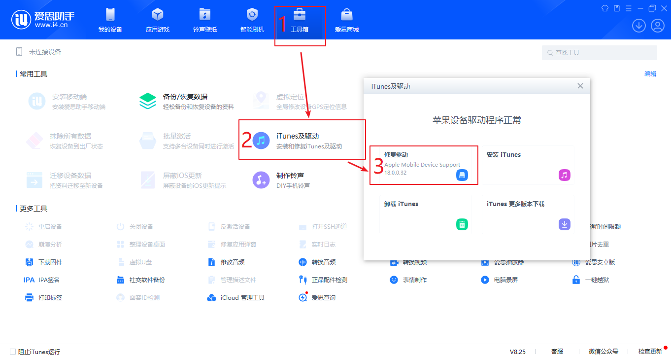 要在iPhone或者iPad和Windows电脑之间实现这种有线网络共享,就需要windows电脑首先正确安装驱动,简单的实现方法就是,下载爱思助手,然后在工具箱里点击驱动修复,具体如下图: