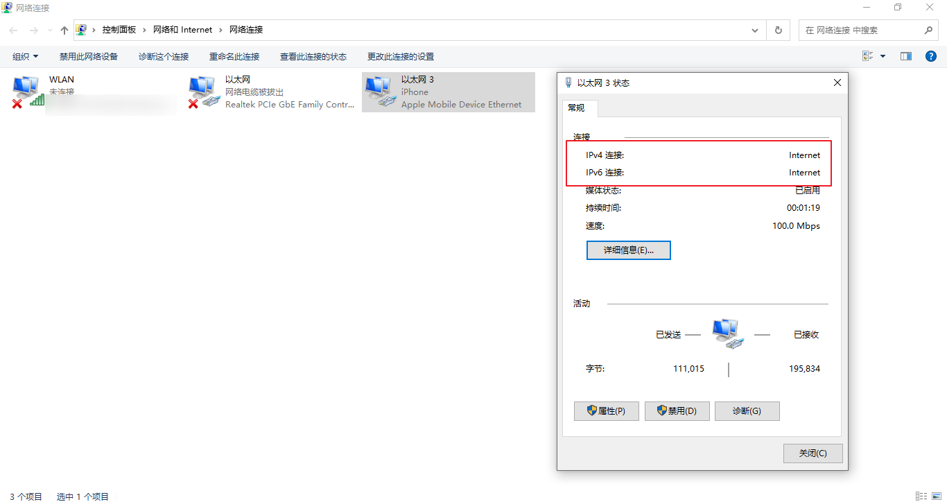说明 :手机共享出的网络是双栈网络,电脑可以同时访问ipv4和ipv6。