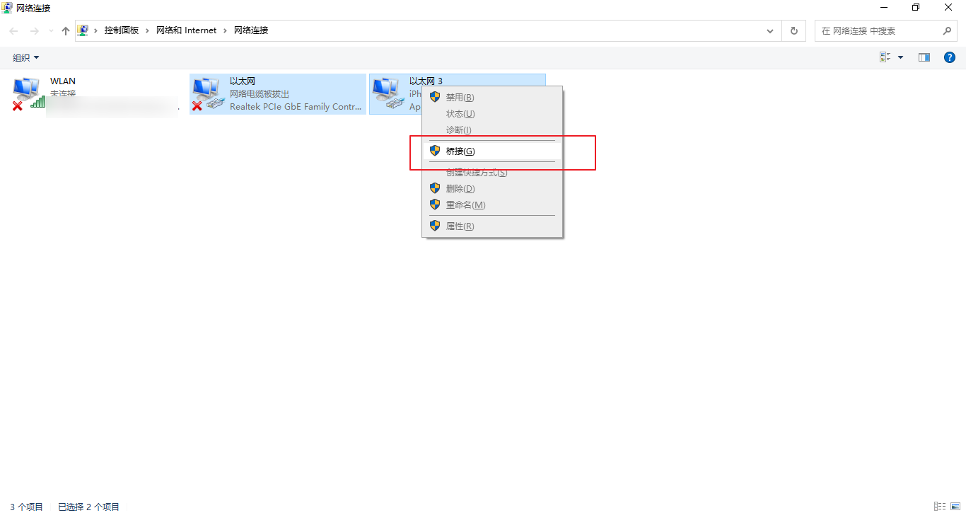 要实现这样的效果,需要Windows电脑本身自带一个网口,或者你插一个windows10/11免驱的USB转RJ45网卡应该也行,之后先按着Ctrl键,然后先后点选两个以太网接口,点击右键,创建网桥,具体如下图: