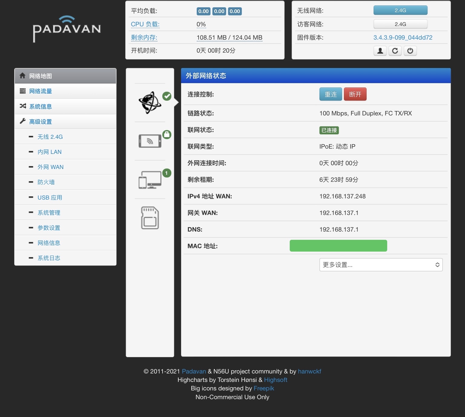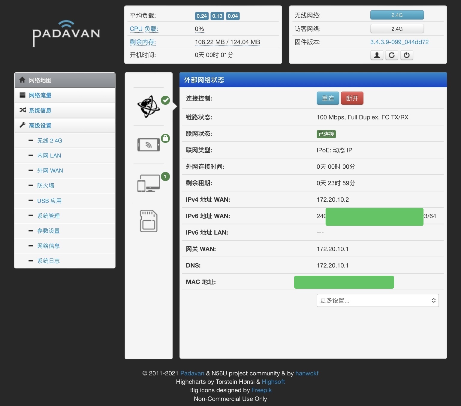 说明 :从上图可以看到,路由器wan口是可以同时获取手机分配的ipv4和ipv6地址的,那么padavan和openwrt固件是可以进行ipv6中继的,使得连接到路由器的下属设备全部可以获取到ipv6地址。或者最简单的方式,就是把路由器改AP模式,仅做无线接入点,下接设备全部由手机直接分配双栈网络。